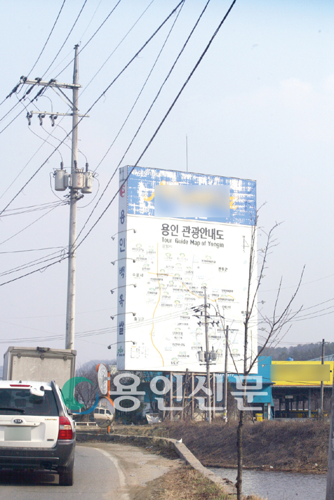 처인구 양지면 지곡리 영동고속도로변에 설치돼 있는 용인 관광안내도. 영동고속도로나 인근 국도를 통행하는 차량이 볼 수 있게 설치되어 있는 대형 관광안내도이다. 그런데 엄청난 크기임에도 불구하고 도로에서는 바로 확인 가능한 글씨는 ‘용인관광안내도’ 7자 뿐. 지도의 자세한 내용을 보려면 안내도 근처로 이동을 해야 한다. 영동고속도로에선 주행 중에 볼 수 없으니 갓길에 주차를 하고 봐야하고 인근 국도에서는 안내도 앞으로 차량을 움직여야 볼 수 있다. 차라리 용인의 특산물 같이 시를 홍보하는 내용이면 어땠을까….