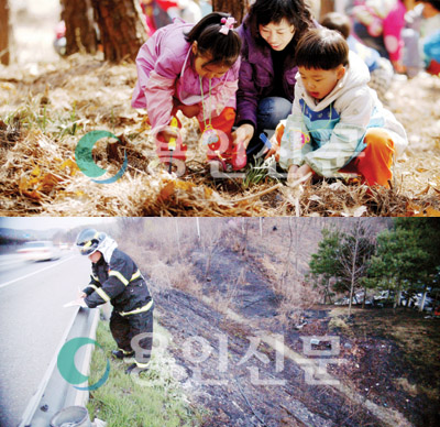 지난 4월 5일 식목일, 전국에서 하루 새 18건의 산불이 발생했다고 한다. 통계상으로도 식목일을 전후한 산불발생건수가 급격히 증가하고 있다. 식목일 산불발생이 평일의 23배에 달한다고 하니 아이러니가 아닐 수 없다. 사진은 지난 5일 수지구 풍덕천1동 토월약수터에서 야생화를 심고 있는 어린이들(상)과 지난 6일 기흥구 언남동에서 발생한 야산의 화재조사를 하고 있는 소방대원(하).
