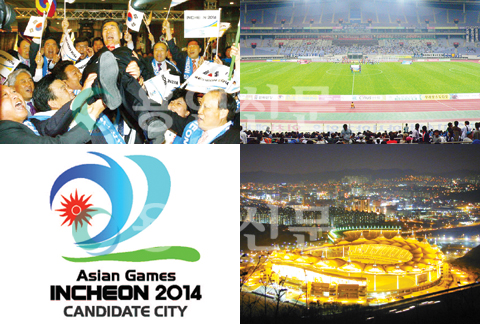 인천시가 인도 뉴델리를 물리치고 쿠웨이트시티에서 열린 아시아올림픽평의회(OCA) 총회에서 40억 아시아인의 스포츠제전인 2014년 아시안게임 개최지로 17일 오후 10시 6분경 최종 결정됐다.