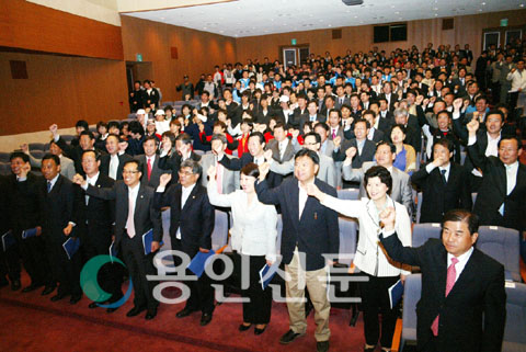 경기도 체육대회에 참가하는 용인시 대표 선수들이 출전에 앞서 필승의 결의를 다졌다.