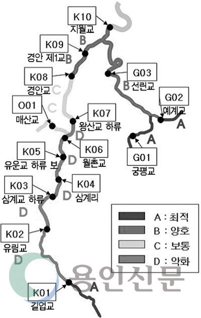 또한 조사지점별 물환경평가에서 호동 길업교를 제외한 용인 경안천 전 구간이 D 등급을 받아 생태환경이 급격히 나빠졌음이 드러났다.