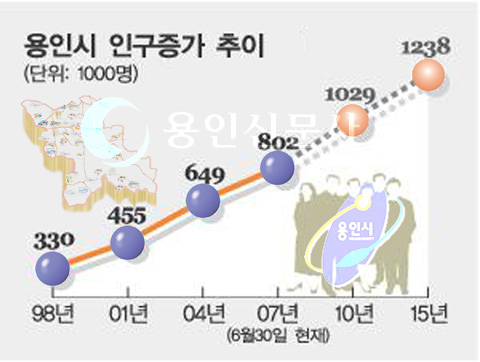 용인의 인구는 지난해 말 77만 8000여명에 비해 6개월만에 2만2000여명(2.8%) 증가 했으며 10년 전인 1997년 말의 30만 3000여명에 비해 무려 2.5배가 늘어났다.