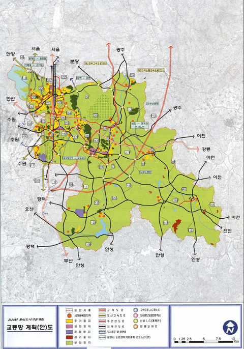 또, 남북축 교통량이 경부고속도로에 집중돼 교통 혼잡을 야기하는 만큼 이에 대응하는 대체 고속화도로를 계획하고 영덕~양재간 고속화 도로를 계획하는 한편 분당선 연장선, 신분당선 등 도시철도계획, 용인경전철을 반영해 용인시 도로정비기본계획과 연계한 도시 내 방사환상형 교통체계를 구축한다는 계획이다.