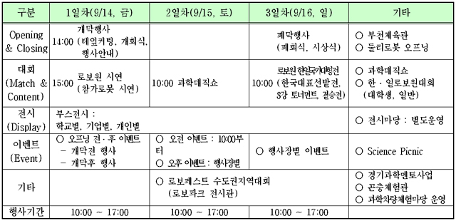 경기과학축전 개막식에는 부천의 명예시민인“둘리”로봇이 안내하며, “로보원 대회”를 시범공연하고, 축제기간동안 휴머노이드 체험대회, 로봇퍼포먼스 등 다양한 볼거리와 체험관을 마련하여 초·중·고등학생들의 과학에 대한 꿈을 키워주며, 학부형과 기업인들의 관람객들로 하여금 흥미롭고 교육적으로 가치가 있는 축제가 될 것이다.