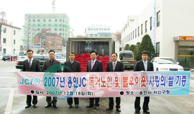 이 회장을 비롯한 용인 JC 회원들은 지난 18일 ‘용인JC 독거노인 및 불우이웃을 위한 사랑의 쌀 기증식’을 열고 쌀 200포를 전달했다.