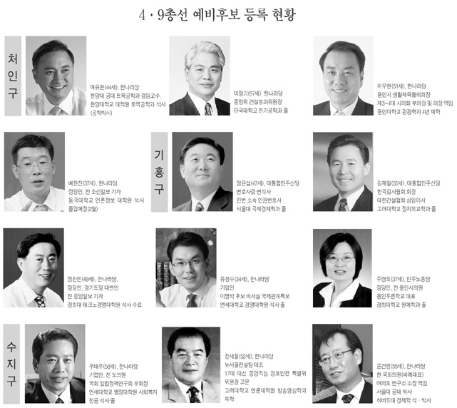 선관위에 다르면 대통합 민주신당의 경우 김재일(55·남) 한국 감사협회회장과 정은섭(47·남) 변호사 등 2명이 예비후보로 등록했다. 한나라당은 지난해 대선당시 용인(갑) 선거대책위원장을 역임한 정찬민(49·남) 경기도당 대변인과 대선당시 이 후보 측 국제관계 특보를 맡았던 유창수(34·남)씨 등이 등록했다. 또, 민주노동당 주경희(37·여) 전 시의원도 지난해 12월 31일 예비후보로 등록했다.