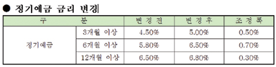 목돈을 운용하는 상품 중 정기예금의 금리는 6개월6.50%(연수익률6.58%), 12개월6.80%(연수익률7.01%)로 인상했다.