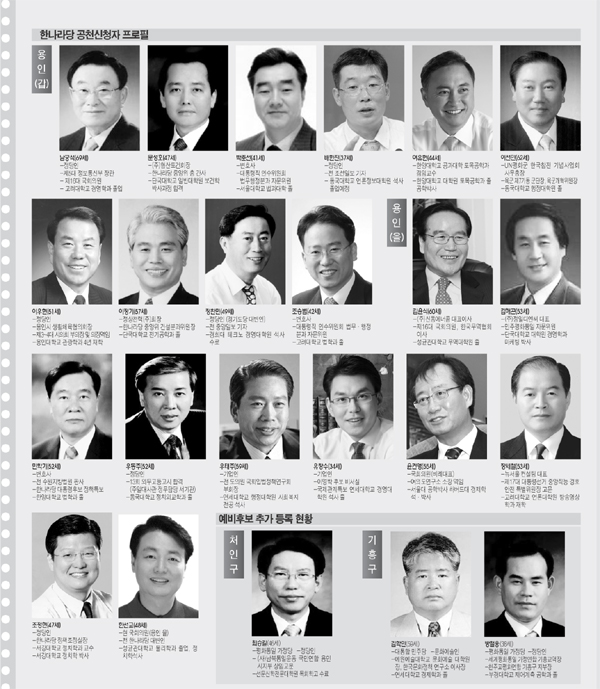 한나라당에 따르면 용인 (갑) 지역의 경우 남궁석(69세)전 국회의원, 문성호(47세) ㈜ 협산토건 회장, 박준선(41세) 변호사, 배한진(37세) 전 조선일보 기자, 여유현(44세) 한양대학교 토목공학과 겸임교수, 이선민(62세) 전 육군 제7기동 군단장, 이우현(51)전 용인시의장, 이정기(57세)한미SMS주식회사 회장, 정찬민(49세)전 중앙일보 기자, 조승범(42세) 변호사, 비공개 1명 등 총 11명이다.