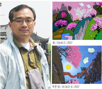 요즘은 우주를 그리고 있다. 지난 여름에 이사왔다는 그의 서울 구기동 화실을 막바지 눈이 펑펑 내리던 3월 어느날 방문했을 때, 클래식 음악이 흐르는 방안에는 아주 상상적인 우주 그림이 그려지고 있었다. 우주 안에 온갖 사물들이 둥둥 떠다니고 있는 그림.