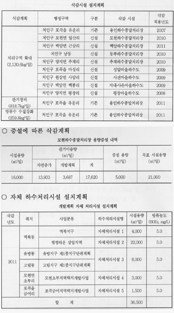이를 위해 시는 총 3900억 원을 단계별로 투자해 모현, 동부, 추계, 백암 등 하수처리시설을 신설한다. 특히 204㎞의 하수분류 관거 정비사업과 함께 하수처리시설 방류수질을 BOD 4~5ppm이하로 유지하는 등 수질개선사업을 2010년까지 마무리 할 계획이다.
