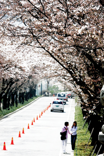 이제 꽃망울을 터뜨리기 시작한 호암미술관 벚꽃 길. 흰옷을 입은 벚꽃이 눈부신 자태로 환상의 세계를 뽐낸다. 벚꽃에 녹음이 어우러져 봄기운이 물씬 풍기는 가운데 따사로운 봄 햇살 사이로 한 연인이 데이트를 즐기고 있다.