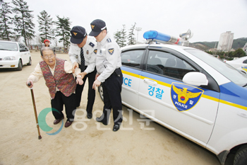경찰관의 도움을 받아 투표장까지 오는 할머니의 발길이 안쓰러워 보인다.