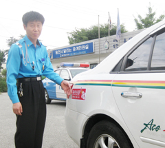 본사와 용인모범운전자회는 사망사고 줄이기 캠페인의 일환으로 쿄통안전 스티커를 제작, 회원들의 차량에 부착키로 했다. 사진은 자신의 택시에 스티커를 부착하고 있는 용인모범운전자회 이용구 총무부장.