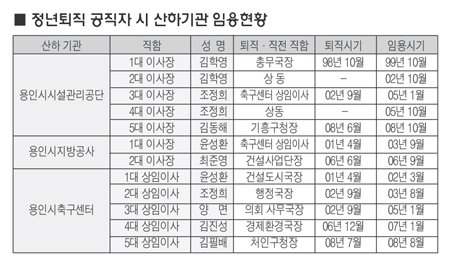 시설관리공단과 지방공사, 축구센터 등은 설립 당시부터 현재까지 모두 퇴직 공무원이 임명돼 ‘퇴직 공무원을 위한 자리’라는 불명예를 안고 있는 실정이다.