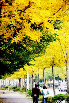 길게 늘어선 언덕길을 따라 빽빽하게 들어선 은행나무에서 은행잎이 노란 자태를 자랑한다.은행잎이 떨어져 거리를 수북하게 덮으면 영화 속 주인공처럼 사진을 찍는 재미가 쏠쏠하다. 사진은 지난 23일 처인구 역북동 명지대길에서 산책을 즐기는 부부.