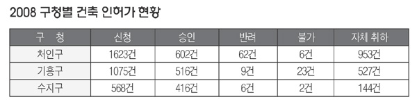 이 같은 현상에 대해 지역 건축학계는 “경제상황 등을 감안할 때 건축 관련 인·허가 업무는 법적 문제가 없는 이상 되도록 승인하는 것이 옳다”며 “공직자들의 경험상 문제가 예상되는 곳의 경우 준공 후 사후 지도 관리를 통해 법적조치 등을 취하는 것이 옳은 방법”이라고 지적했다.