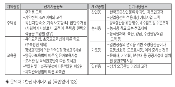A)우리나라의 전기요금체계는 전기를 사용하는 용도에 따라 6가지 계약종별로 구분하여 운영하고 있으며, 종별 전기공급비용, 에너지정책 등 여러 요인이 반영되어 종별간 요금수준에 차이가 있습니다.