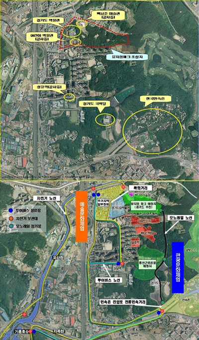 자전거는 무인이용시스템을 구축해 결재하도록 하고 지역에 추진될 통산공원부터 주요 시설을 거쳐 기흥호수공원까지 이어지는 방안이 제시됐다.
