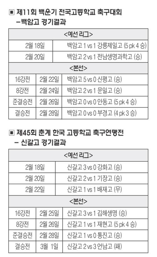 그동안 춘계 연맹전 3연패를 이어 온 신갈고는 대회 마지막날인 지난 1일 진주 모덕 축구장에서 열린 서울 언남고와의 결승경기서 연장 접전 끝에 3대2로 석패, 대회 4연패의 꿈을 접었다.