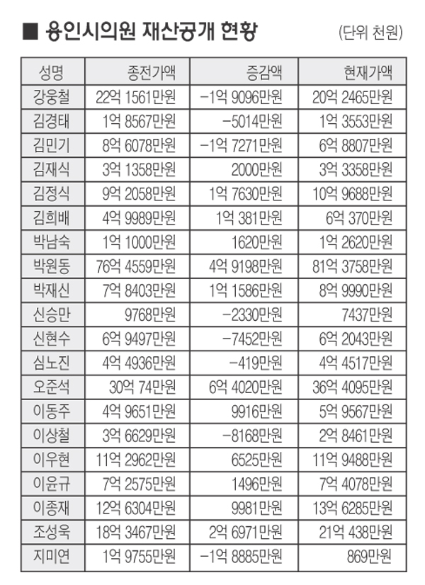 지난달 31일 경기도보에 공고된 도 내 공개대상 공직자 재산등록사항에 따르면 용인시의원 중 박 위원장이 총 81억 3758만원의 재산을 신고해 최고를 기록한 반면, 지미연 의원은 869만원으로 최하위를 차지했다.<표 참조>