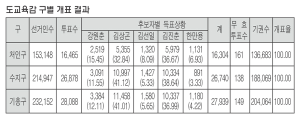 김 당선자는 이 중 42만 2302표(40.81%)를 획득, 34만 8057표(33.63%)를 획득한 김진춘 현 교육감을 약 7%차로 누르고 당선됐다.