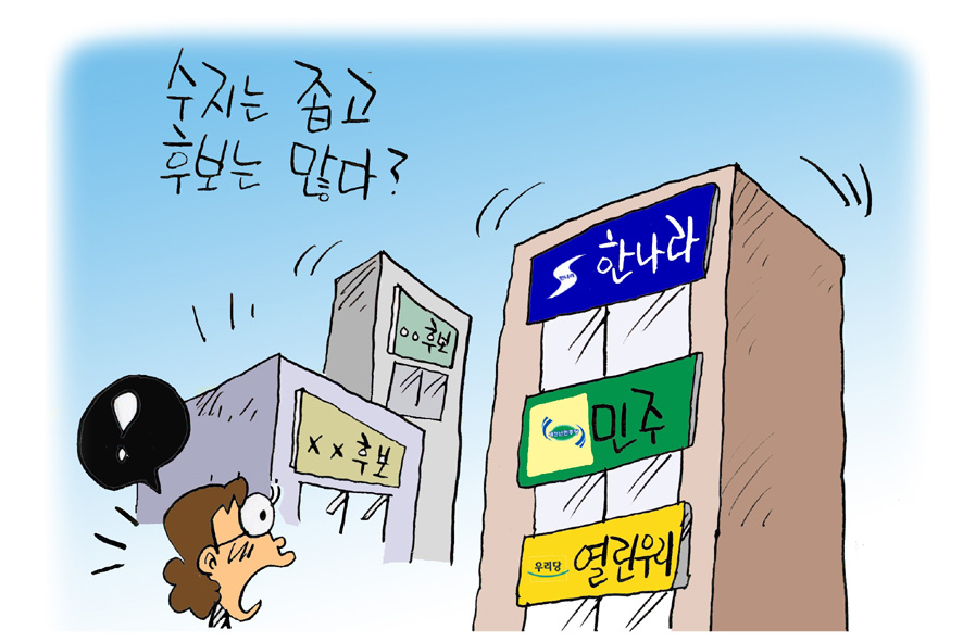 정치신인들이 대거 몰린 용인을 선거구에서는 3당 후보들이 한 건물로 몰리는 등 이색적인 풍경이 벌어져 눈길을 끌고 있다.