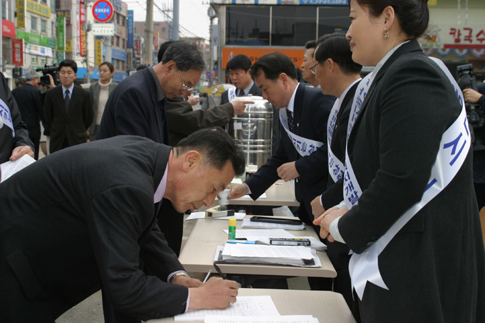농협용인시지부 앞에서 서명운동을 벌인 이 의장과 이종재 부의장 등 시의원들은 ‘난개발을 가중시키는 상현동 택지개발 반대’라고 적힌 어깨띠를 두르고 지나가는 시민들에게 서명해줄 것을 호소했다.