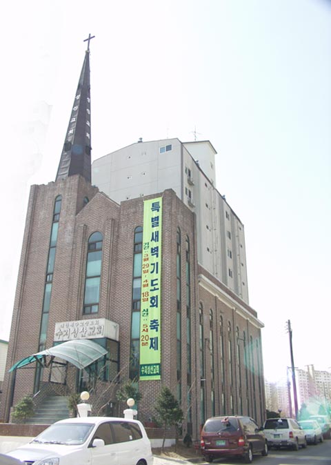 동천동 325-13번지 일대 지금의 아담한 교회를 짓기까지 천막생활 8년, 조립식 건물에서 5년, 13년의 시간이 필요했다.