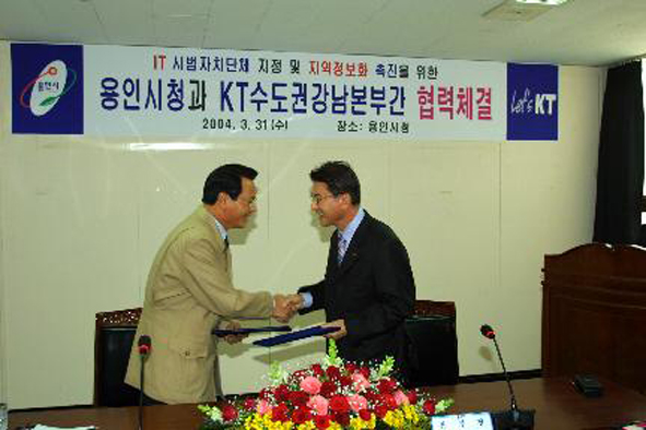 지난달 31일 용인시청 소회의실에서는 이정문 시장과 양봉기 KT 수도권강남본부장이 지방자치단체 중 최초로 지역정보화 촉진을 위한 상호협약을 체결했다.