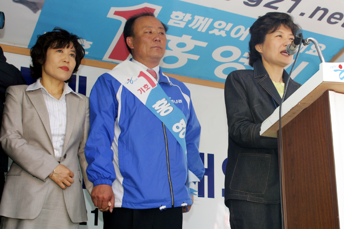 선거를 하루 앞둔 14일 오후 1시께 한나라당 박근혜 대표는 용인갑 선거구 홍영기 후보를 방문, 용인재래시장 입구(구 경찰서 앞)에서 홍 후보와 한나라당 지원유세를 하며 막판 부동층 공략에 주력했다.