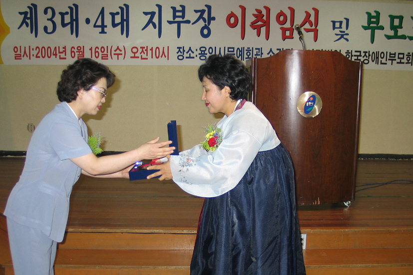 지난 2000년에 취임한 이후 4년간 장애아들의 권익증진과 편의를 위해 팔방으로 노력한 김경화 전지부장은 이임사에서 “4년이란 세월속에 초라하지만 협회의 기초가 세워지게 됐고 아이들도 조금씩 좋아지고 건강해지는 모습을 보니 기쁘다”며 “게으른자는 불평을 말하고 부지런한자는 희망을 말한다고 하니 새롭게 취임하는 조영애 지부장과 임원들은 오늘을 사랑하고 더욱 최선을 다하길 바란다”고 격려했다.