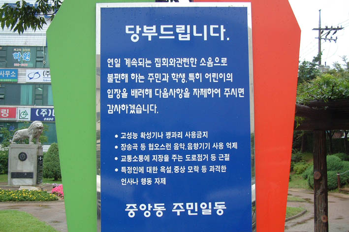 이에 김량장동 주민들은 지난해 용인경찰서에 건의서를 제출해 집회시위로 인한 주민 피해를 최소화할 것을 요구했다. 또 주민들은 지난 2월 라이온스 공원 입구에 확성기 사용 자제와 욕설 등 인신공격 자제 등을 요구하는 안내판을 제작해 설치했다.