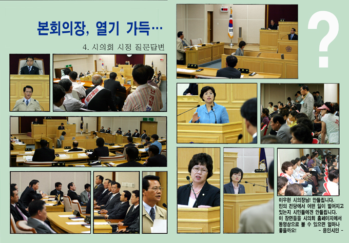 또한 일부 의원들은 보충질의 과정에서 언성을 높이거나 질의시간을 초과해 이 의장이 제지를 하는 등 어설픈 모습도 연출됐다. 한편, 이를 지켜본 방청객들은 “민의의 전당에서 실시되는 시정질문답변을 시민들이 인터넷 홈페이지에서 동영상으로 볼수 있다면 시의회와 집행부 모두 좀더 성숙되지 않겠냐”는 지적을 했다.