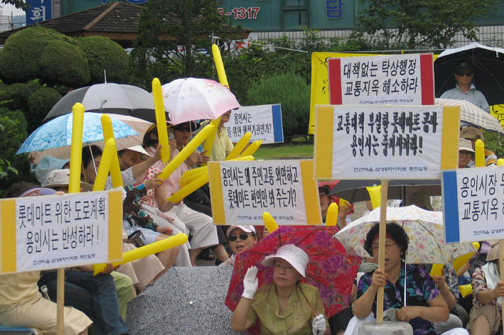 집회에 참석한 주민들은 “시민의 편의를 위한 도로가 아니라 L마트의 진출입로를 확보해 주는 도로”라며 “아파트 입구의 백설교를 지나지 않게 도로 계획을 다시 할 것”을 요구했다.