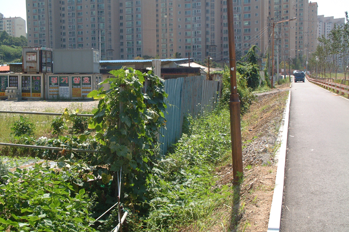 100m남짓한 이 산책코스의 절반은 나무가 우거진 근린공원이고 나머지 절반은 중장비가 출입하는 허름한 공장과 폐 건축물 집하장이다.