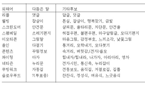 아직은 어색한 이 우리말들은 국립국어연구원이 지난 7월부터 ‘모두가 함께하는 우리말 다듬기’ 사이트(