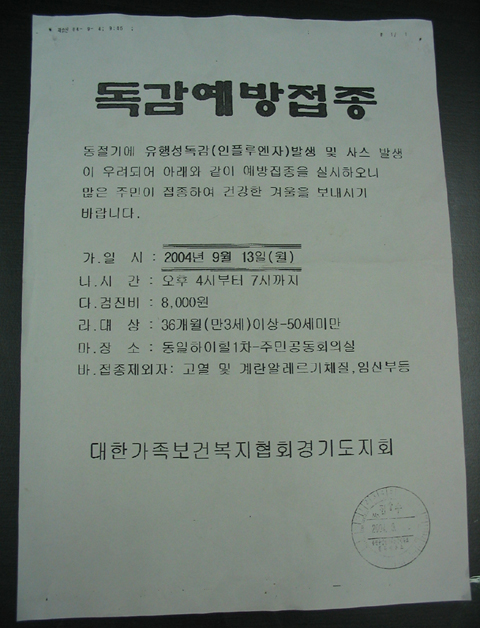 보건복지부 산하 대한가족보건복지협회(이하 가족협회) 경기지회는 지난 10일부터 16일까지 용인 수지, 기흥지역의 아파트를 대상으로 약 500여명 가량의 시민들에게 독감예방접종을 실시했다. 이 협회는 성교육, 가족계획, 모자보건, 노인복지, 아동복지 등 국민건강을 위한 각종 사업을 담당하기 위해 보건복지부가 만든 협력단체이다.