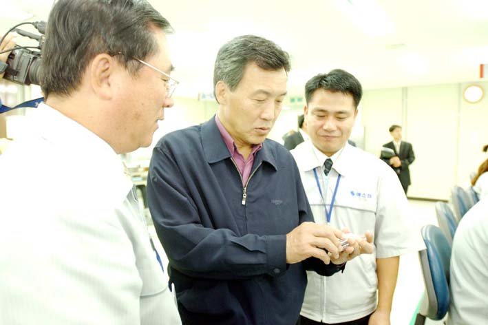 손학규 경기도지사가 26일 일요일 오전, 추석 연휴 중 가동 중인 남사면 소재 에스켐 주식회사를 방문해 근로자들을 격려하고 있다.