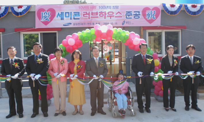 삼성전자는 지난 14일 이동면 송전리에서 이정문 시장과 지대섭 부사장을 비롯한 100여명이 참석한 가운데 ‘제1호 세미콘 러브하우스’ 준공식을 갖고, 지역내 비인가 중증장애인 보호시설인 생수사랑회(원장 전순범)에게 준공된 시설을 기증했다.