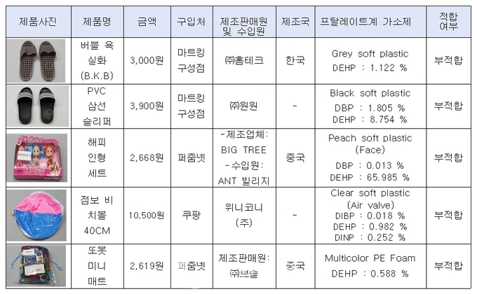이번에 부적합으로 판정된 5개 제품은 간 등에 손상을 줄 수 있는 프탈레이트계 가소제(DEHP,DBP,DINP,DIBP)가 0.1~65.9% 검출돼 안전기준(총합 0.1%)을 최대 660배 초과한 것으로 조사됐다.