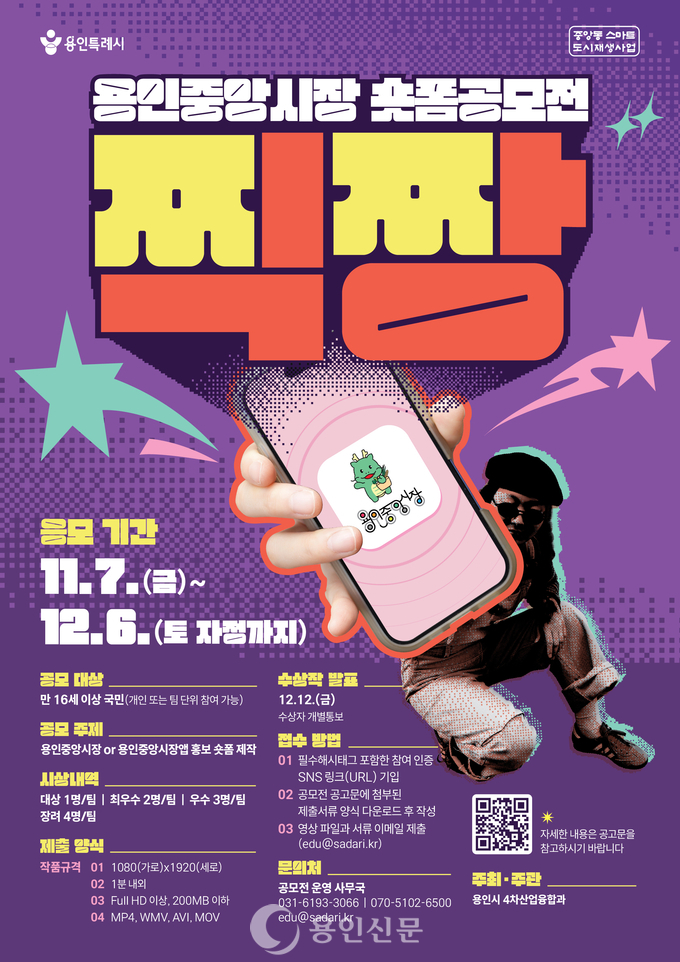 용인신문 | 용인시는 용인중앙시장의 생동감과 매력을 짧은 영상으로 표현하는 용인중앙 숏폼 공모전 ‘찍짱’을 6일까지 공모중이다.