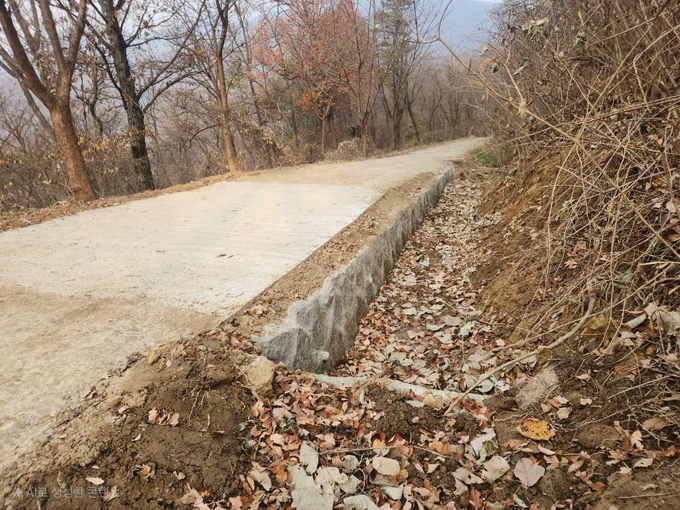 남동 임도는 강우 시 반복적으로 물이 넘치던 구간에 배수관로를 신설하고 노면을 정비해 우천 시 보행자와 차량 통행 불편을 해소했다.