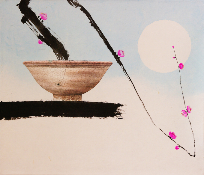 그의 기법은 전통적인 붓질에만 머물지 않는다. 서양의 명암법과 동양의 공기원근법을 혼용하며, 두꺼운 오합 장지 위에 예리한 칼로 형태를 파내고 오려 붙이는 상감 기법을 회화에 도입했다. "달항아리의 명료함을 극대화하기 위해 칼을 쓴다"는 그의 작업은 회화이면서 동시에 고된 조각이자 공예의 과정과 닮아 있다.