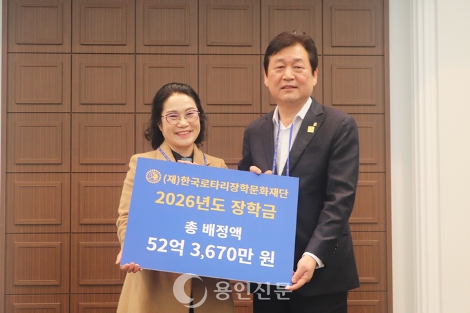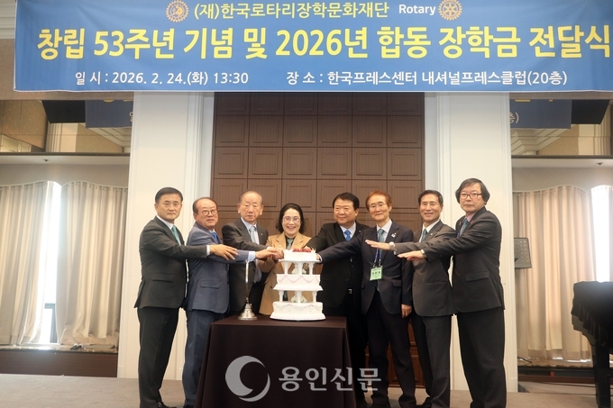 용인신문 | (재)한국로타리 장학문화재단(이사장 신해진, 이하 재단)은 지난달 24일 한국프레스센터에서 한국로타리 지도자와 지구 현·차기 총재, 고액기부자, 관명장학의인을 비롯한 클럽회장 및 재단 임원이 참석한 가운데 ‘창립 53주년 기념 및 2026년도 합동 장학금 전달식’을 개최하고 금년도 장학금 총 52억3,000만 원을 국제로타리 19개 지구 총재에게 전달했다.
