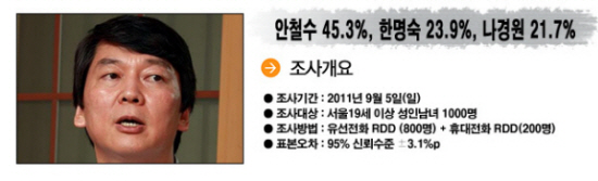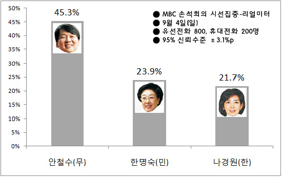 MBC 라디오 “손석희의 시선집중”이 여론조사 전문기관 리얼미터(대표: 이택수)에 의뢰해 9월 4일(일) 서울시 유권자 1천명(유선전화 800명+ 휴대전화 200명)을 대상으로 실시한 서울시장 보궐선거 여론조사에서, 안철수 교수가 무소속으로 출마할 경우 45.3%의 지지율을 기록, 민주당 후보 한명숙 전 총리(23.9%)와 한나라당 나경원 최고위원(21.7%)를 큰 격차로 앞서는 것으로 나타났다. 모름/무응답(9.1%)