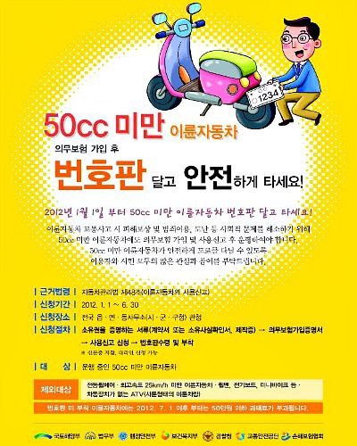 이에 따라 50cc미만 이륜자동차 운행자도 의무보험에 가입하고 관할 시·군 또는 읍·면·동에 사용신고를 해야 한다. 미신고 시는 50만원 이하 과태료 부과대상이다.