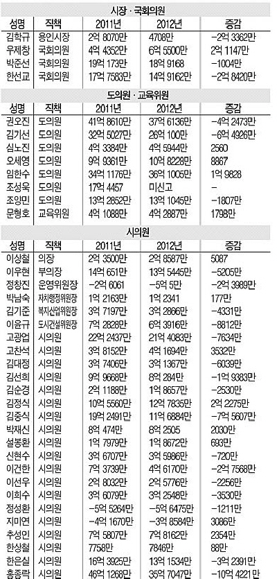 정부와 국회 공직자 윤리위원회, 경기도 공직자 윤리위원회가 지난달 25일 공개한 고위공직자 재산신고 현황에 따르면 총 36명의(조성욱 도의원 제외) 용인지역 선출직 공직자들은 지난해에 비해 평균 1억 2800여 만 원의 재산이 감소한 것으로 조사됐다. 아파트와 토지 등 부동산 가치하락이 가장 큰 원인 이라는 분석이다.