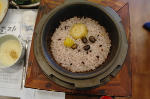 돌솥밥 정식은 고구마, 검정콩, 은행 등 연잎밥과는 다른 맛을 느낄 수 있는 대표음식이다. 비빔밥 그릇이 따로 나간다.