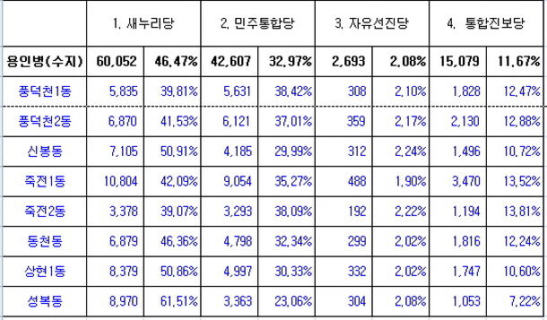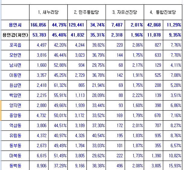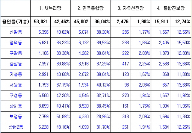 용인지역 31개 읍·면·동 중 새누리당 지지도가 가장 높은 곳은 수지구 성복동(61.51%)으로 나타났으며, 가장 낮은 곳은 기흥구 영덕동으로 36.23%의 지지율을 기록했다. 민주당의 경우 처인구 유림동에서 40.5%로 가장 높았고, 원삼면에서 21.94%로 가장 낮게 나타났다. 통합진보당의 경우 기흥구 동백동에 15.9%를 기록했고, 처인구 남사면에서 4.11%를 기록 가장 낮은 지지율을 보였다.