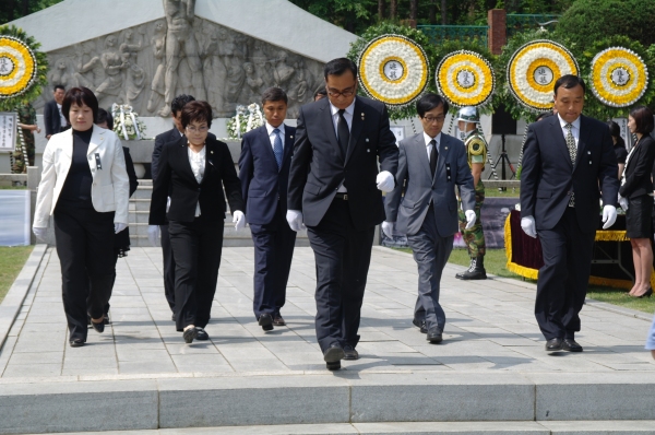 ▲ 제57회 현충일 추념식에 참석한 이우현 시의회 부의장을 비롯한 시의원들이 헌화 및 분향을 마치고 내려오고 있다. |